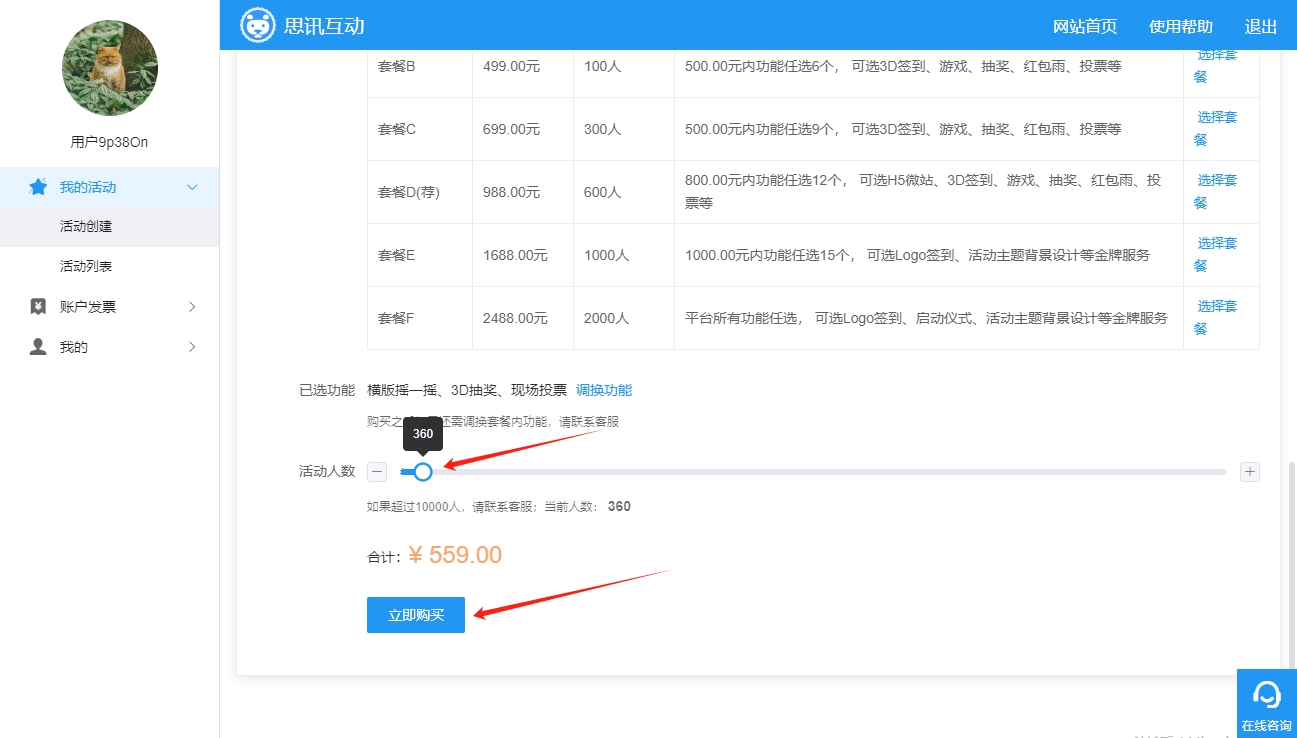 (1)选择了收费版活动,活动信息填写完之后需选择活动所需要的互动功能,这里有2种购买形式:可以按套餐购买,也可单独选择功能。
