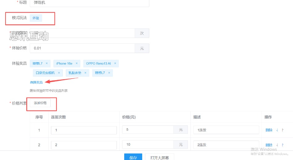 体验模式:按需求自定义体验次数和价格,如下图次数是3,体验价格为0.01元/次(体验价格最低不低于0.01哦),即用户参与时需要支付0.01元就可以体验抽奖,后台导入奖品后还可以选择哪些奖品供用户体验;
