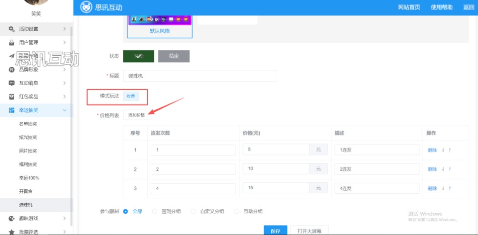 免费模式:可以设置每人免费发送弹珠的个数,如下图中10次,就是可一次发送10颗弹珠;