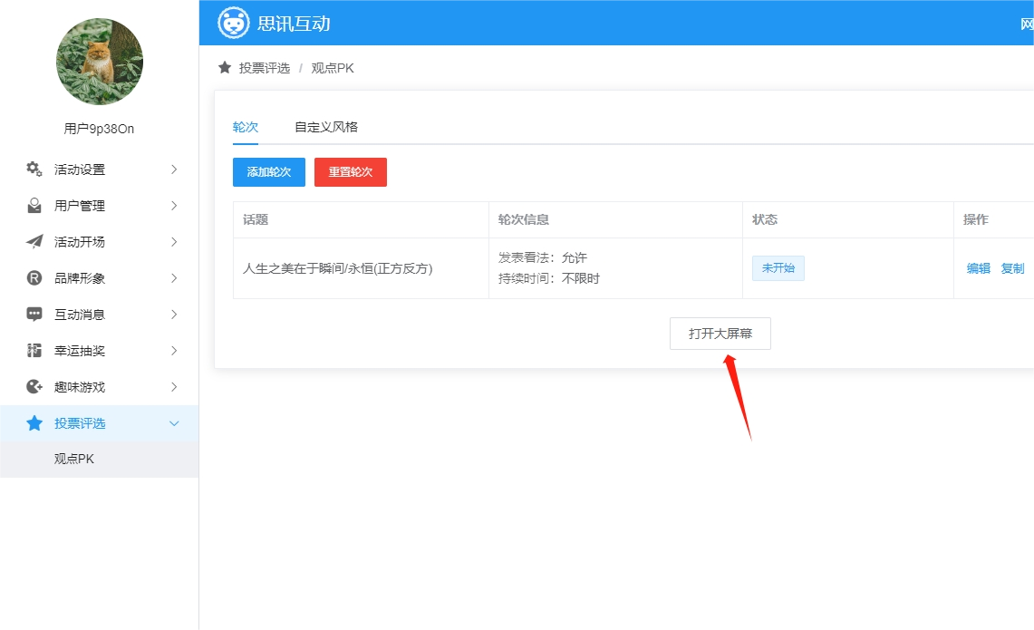 (5)保存后,可查看轮次信息,进行编辑、删除及排序等操作;点击重置会将所有轮次重置为初始未开始状态(进行中的轮次不能重置)如果存在多轮可以点击向上向下箭头移动排序,然后点击”保存排序“即可保存成功。点击打开大屏幕,进入大屏幕界面(如图6)