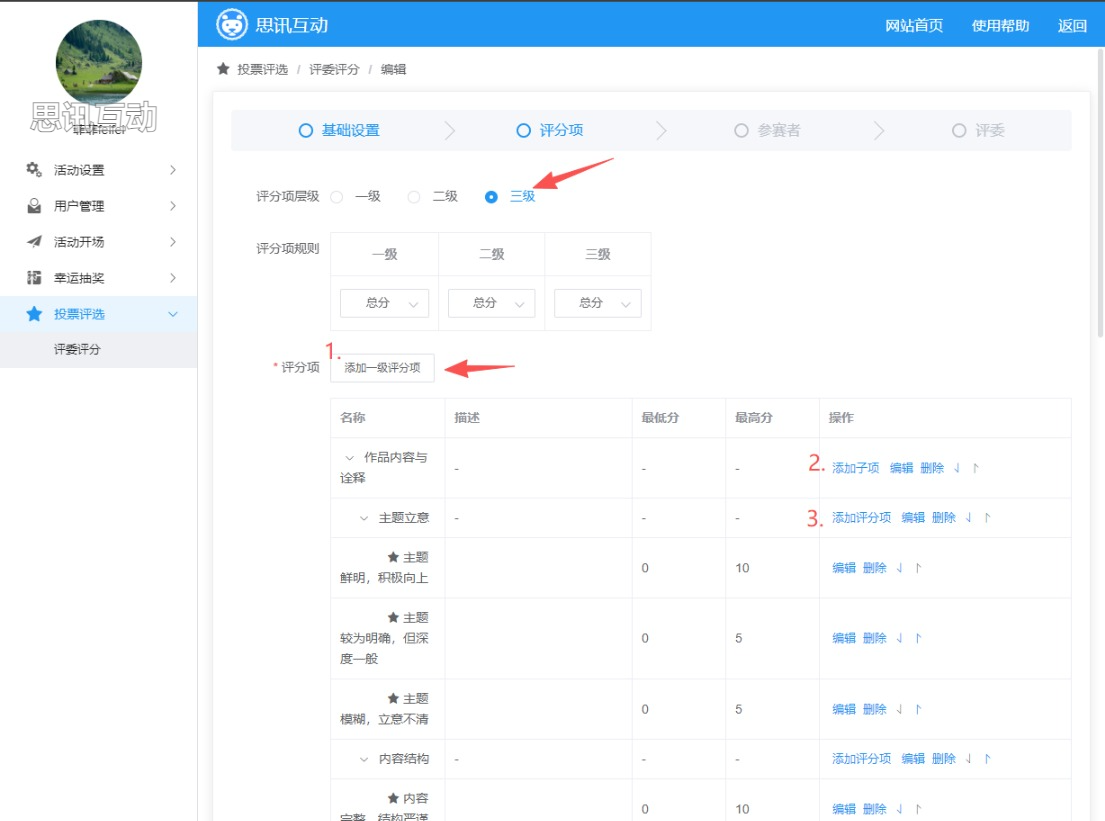(二、)评分项:需要几级就选择几级,例:选择三级评分项,设置好每一项评分项规则,点击“添加一级评分项”--“添加子项”--“添加子分项”,这样是完整的一个评分项。可以编辑删除及调整顺序。