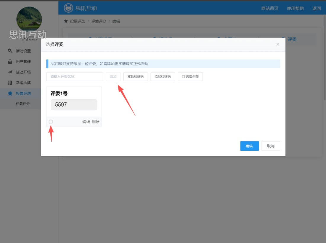 可以直接操作添加评委信息,添加或者移除验证码,添加验证码后评委需要输入验证码验证参与。