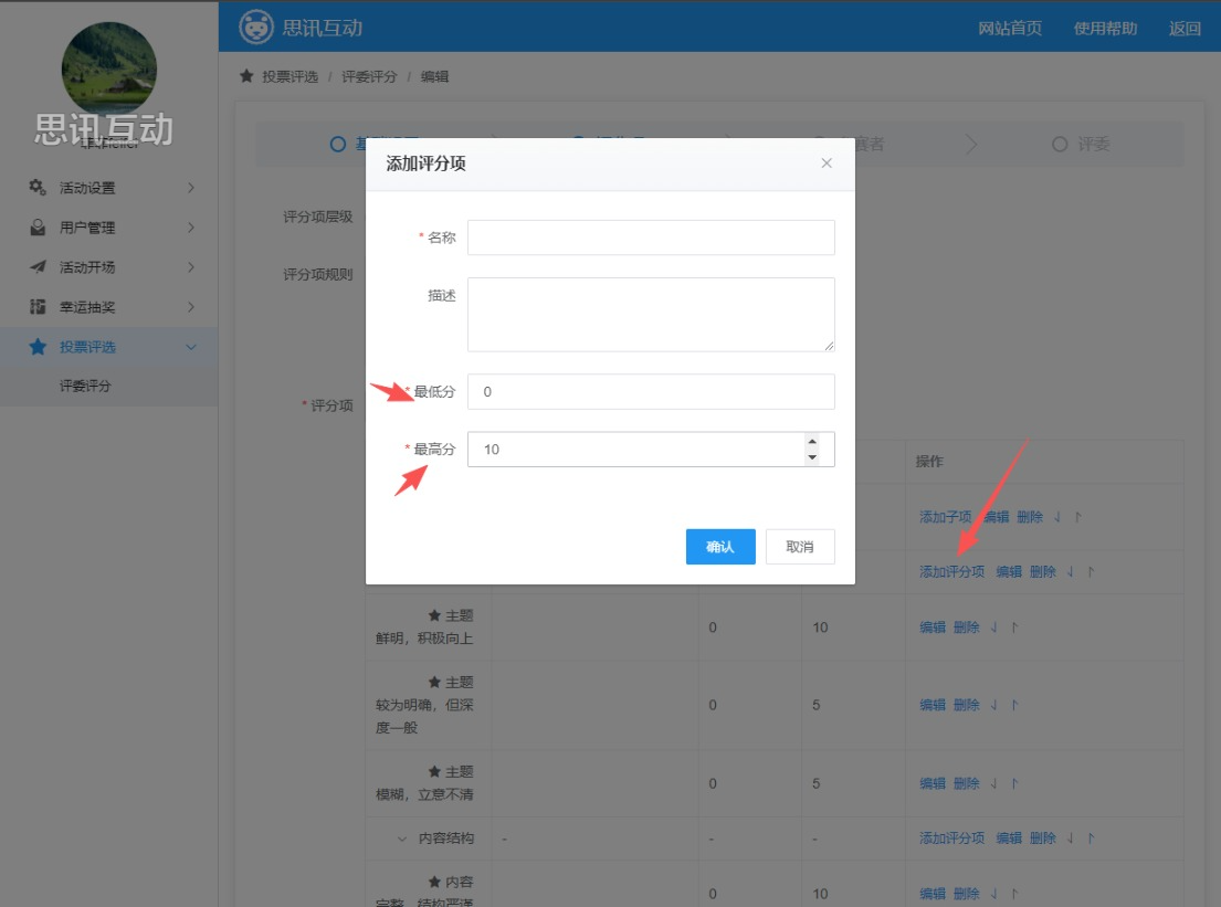 (2.4)添加评分项时可以设置该项的最低分和最高分分数(如下图)。