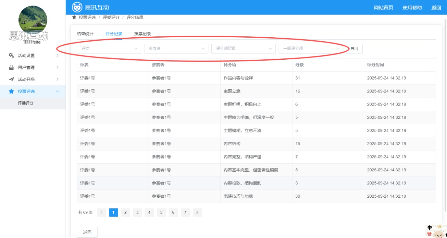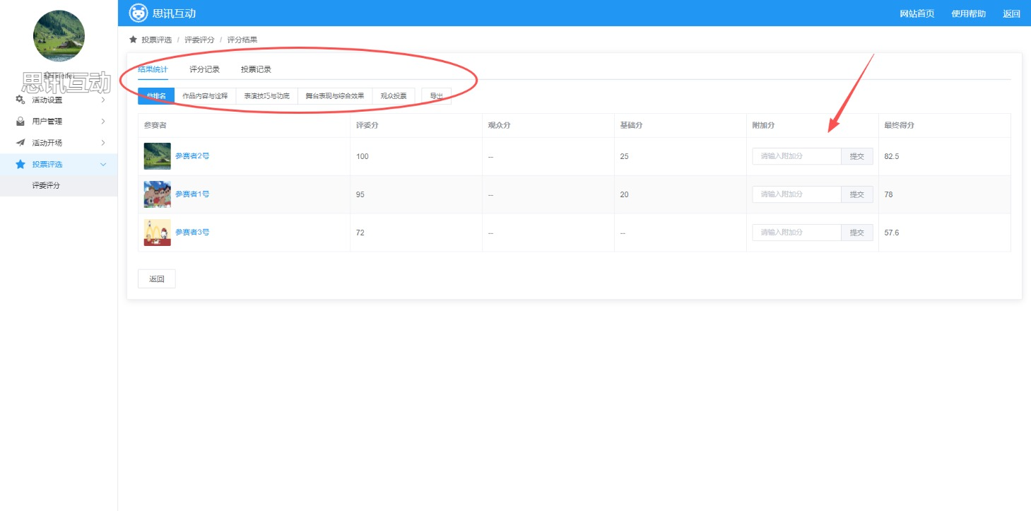 (3)评分结束后后台可以查看评分结果,可以按评分项查看分数,可以添加参赛选手附加分,提交附加分之后实时更新分数。可以导出表格。