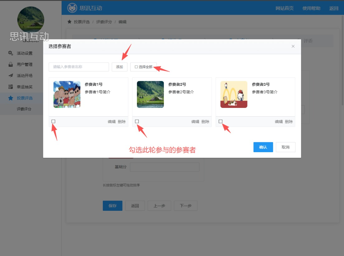 选择参赛者:勾选此轮参与评分的参赛者。(这里可以直接添加参赛者信息后选择,也可以在添加轮次旁的“参赛者”入口添加和查询参赛者信息)