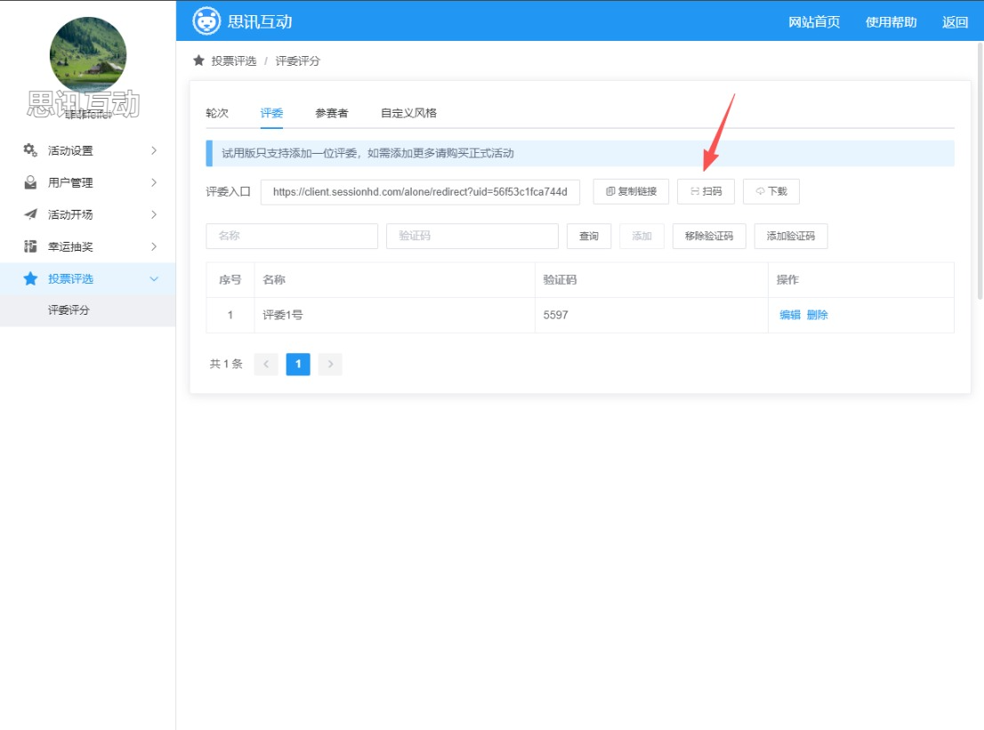 点击“评委”可复制评委入口链接发送、可扫码进入、可以下载评委入口二维码贴至活动处。也可以在这里添加评委信息。