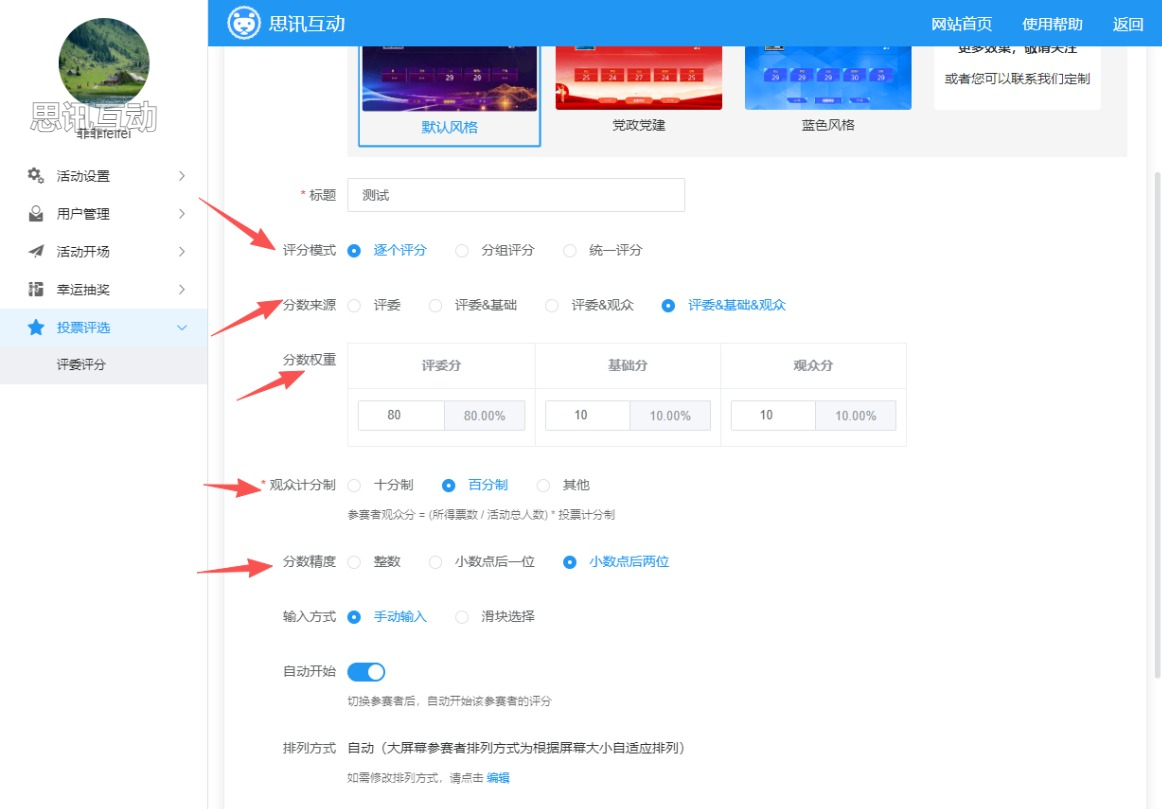 分组评分:参赛者按小组展示表演,评委按小组打分;(选择分组评分在第三步“参赛者”设置中设置分组)