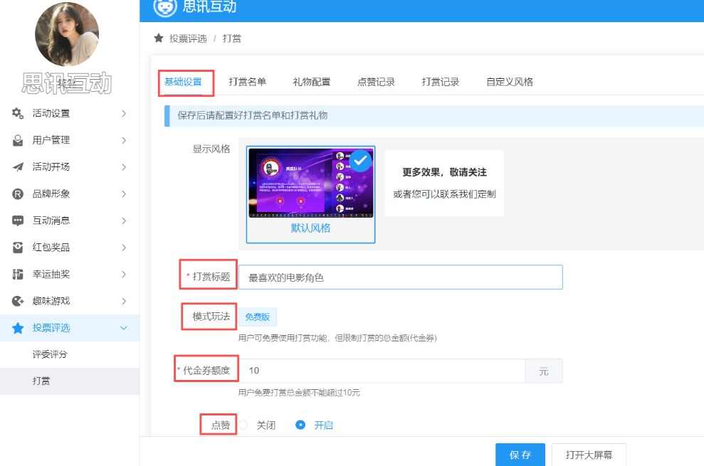 (1)创建活动后,进入活动设置页面,点击“基础设置”,填写好打赏标题(如图1)。模式玩法有两种:免费版和收费版(需联系客服);