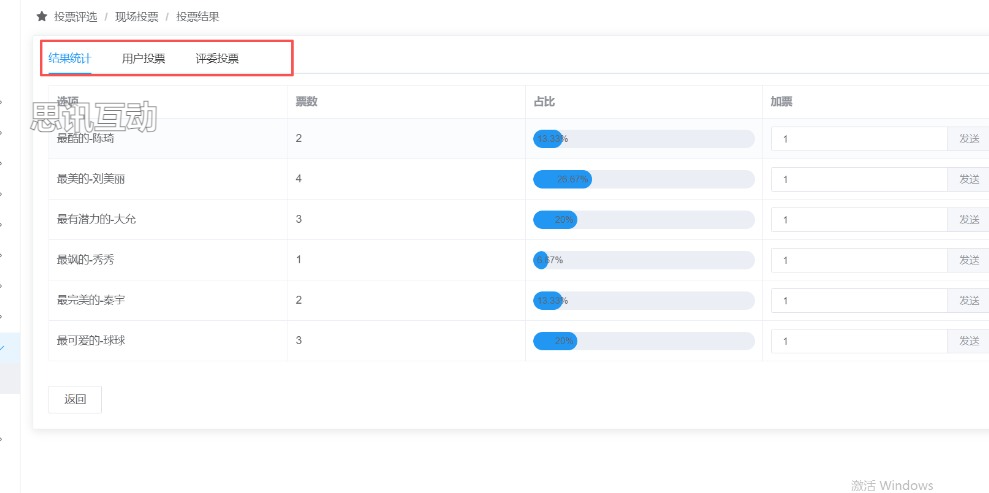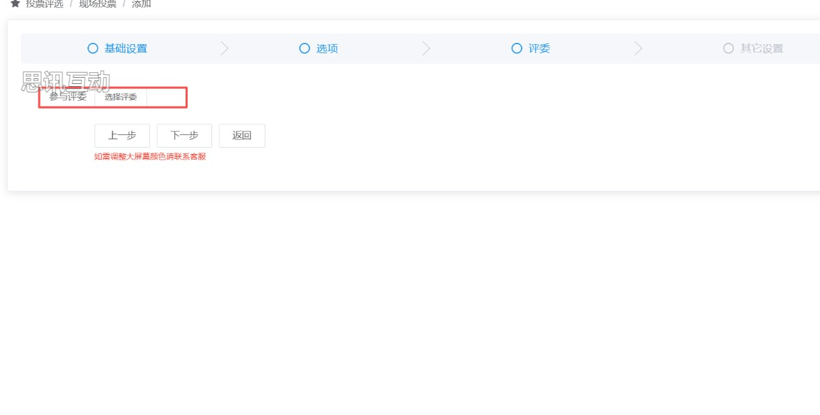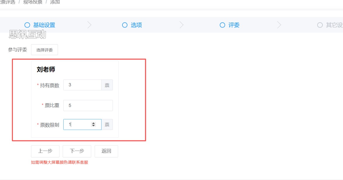 (8)如果有评委参与就需要添加评委(注:如果没有评委可以省略此步直接点下一步);添加好评委后可设置该评委的持有总票数,票比重:每张票的比重(比如1票抵5票),票数限制:该评委只能投的票数;设置完点下一步。如图12