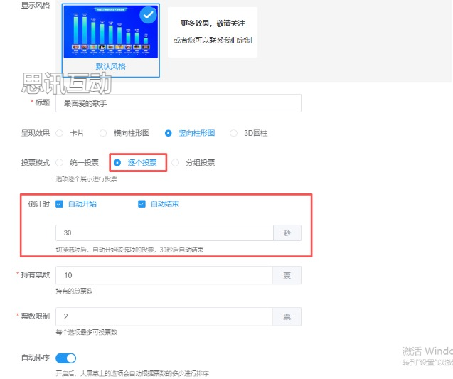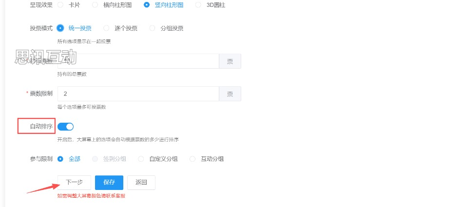 (5)再往下是自动排序:开启后大屏幕会实时根据票数的排名来进行排序,设置好后点击下一步,如图8