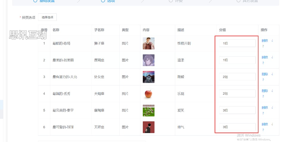 设置分组投票后点击下一步,添加选项后设置好分组就可以,如图7;