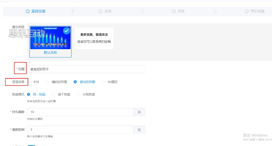 (3)在轮次添加页面,设置好标题,选择呈现效果(卡片、横向柱状图、竖向柱状图、3D圆柱),根据实际情况选择即可如图3。