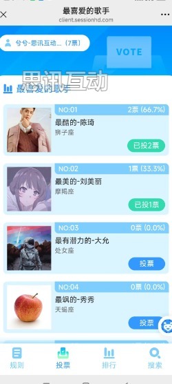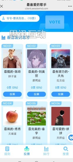 (2)用户扫码后进入手机端投票选项页面,手机端可以查看投票规则,排行版,还可以搜索某个选手的投票情况,如图20。