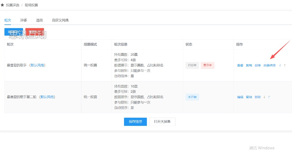 (10)保存后可以进行评委和选项的再次修改,可以对多轮次编辑、复制和删除操作;如图16.