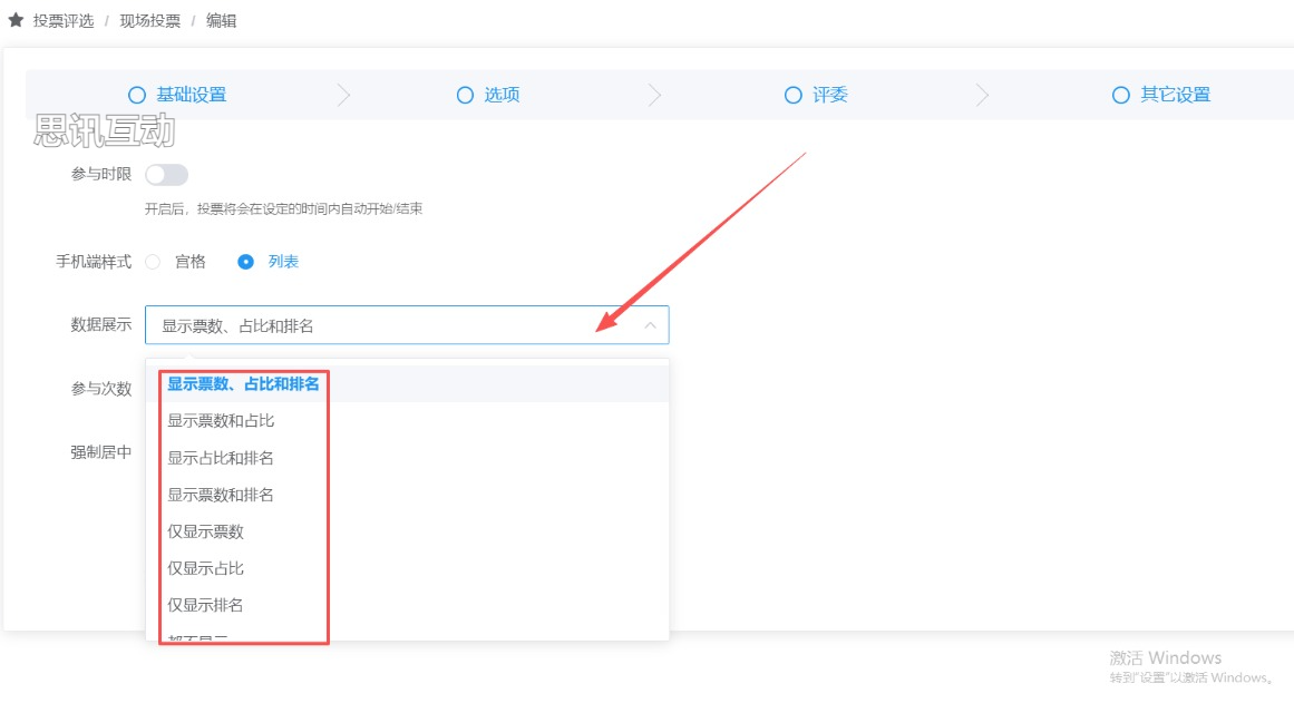数据展示:所投投票选项大屏幕所统计展示的数据,可以按自己投票要求去选择,一共有8种(显示票数、占比和排名,显示票数和占比,显示占比和排名,显示票数和排名,仅显示票数,仅显示排名,仅显示占比,都不显示),如下图14。