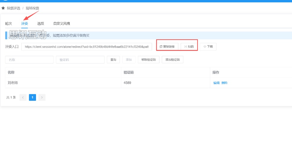 (11)其中,点击评委选项卡,也可以进行评委的添加和修改,注意的是,试用版只能添加1位评委,这里是评委扫码参与的入口,可以下载下来贴到评委处;如下图17