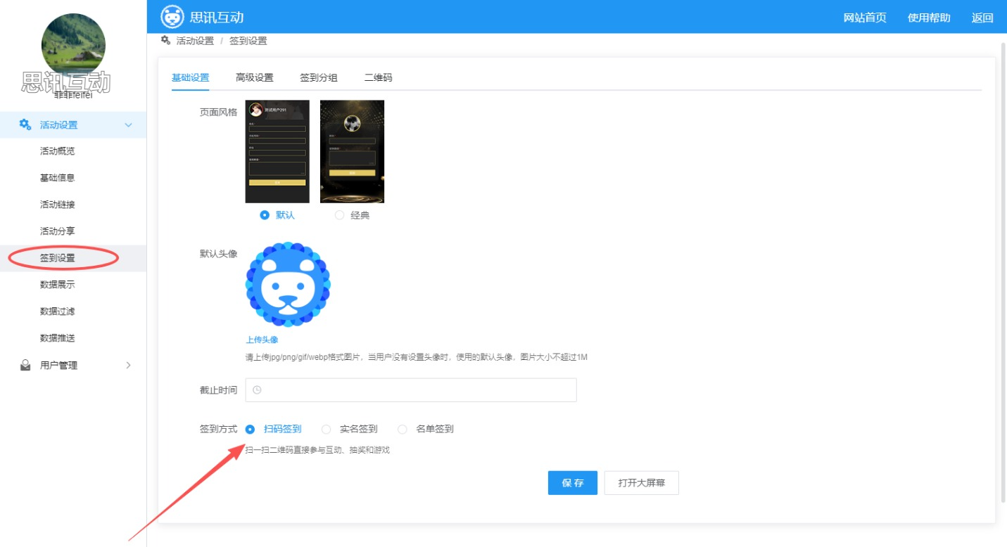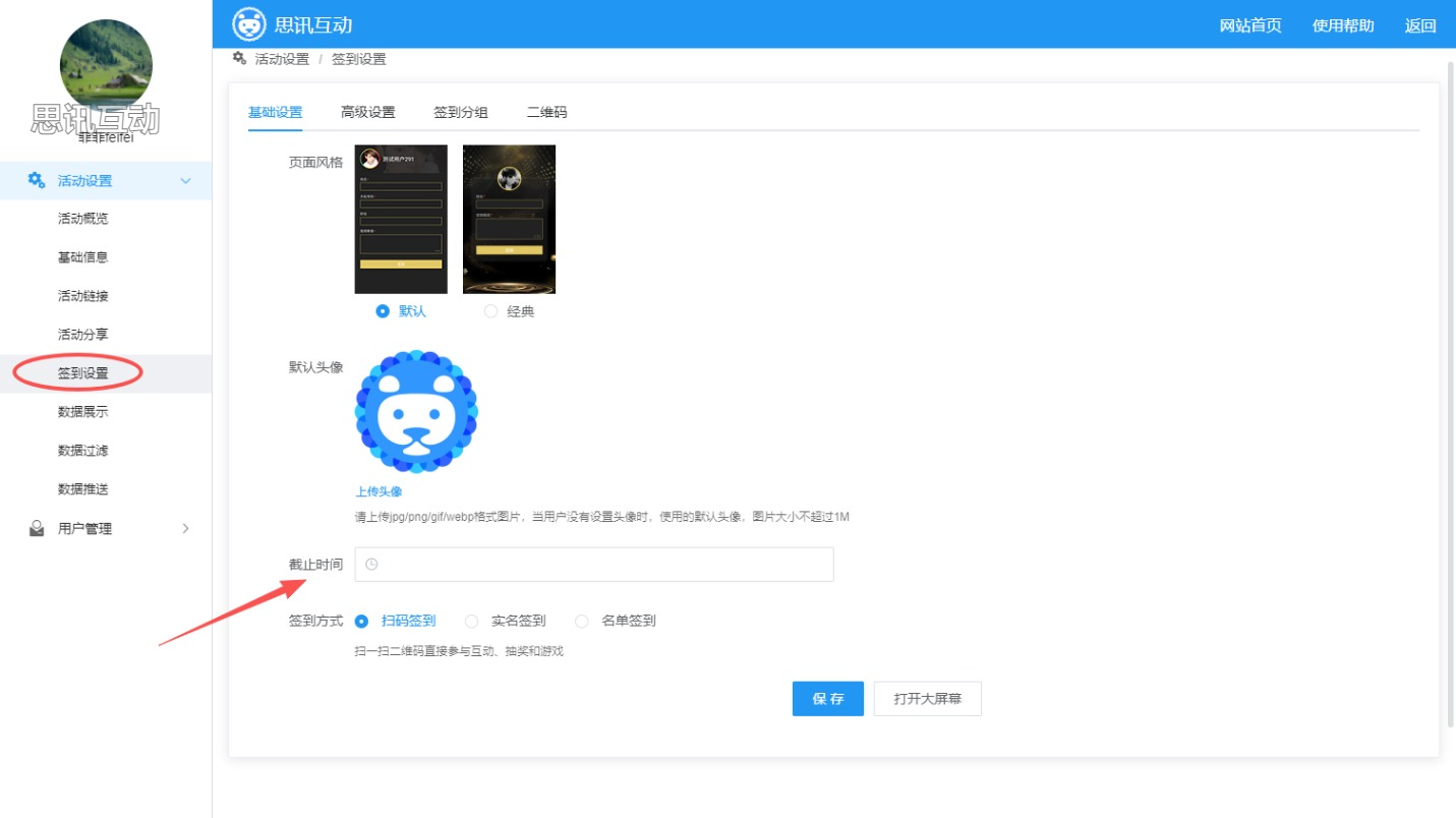 (1)点击“活动设置->签到设置”,可打开基础设置页面。可以更换手机端签到页面的风格。设置了截止时间后,过了这个时间点,用户将无法签到成功,无法参与活动。打开显示人数,大屏幕的画面会显示已签到的人数