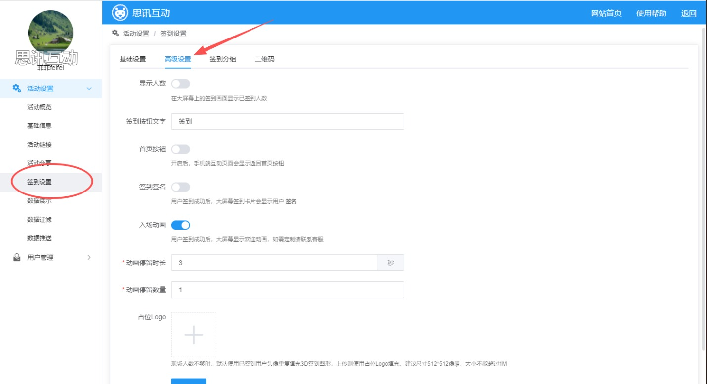 (6)占位logo:现场人数不够时,默认使用已签到用户头像重复填充3D签到图形,上传则使用占位Logo填充,建议尺寸512*512像素,大小不能超过1M。