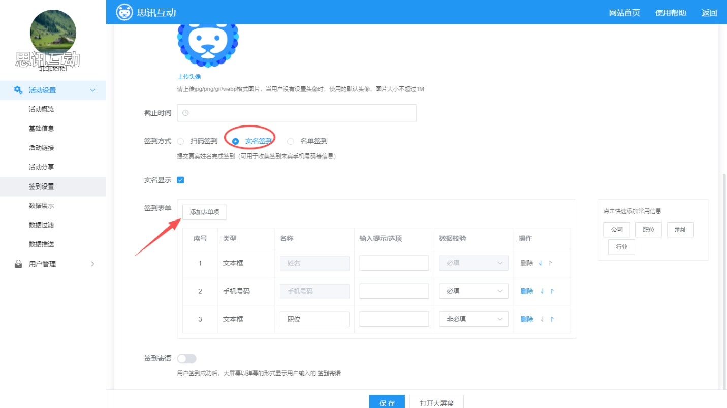 (1)实名签到:开启实名显示后,大屏幕将显示签到用户的真实姓名。如果需要收集手机号、公司、部门等信息,点击添加表单项去添加相应内容就可以;通用表单项可以设置单选、下拉、多选、数字内容如图3、图4.