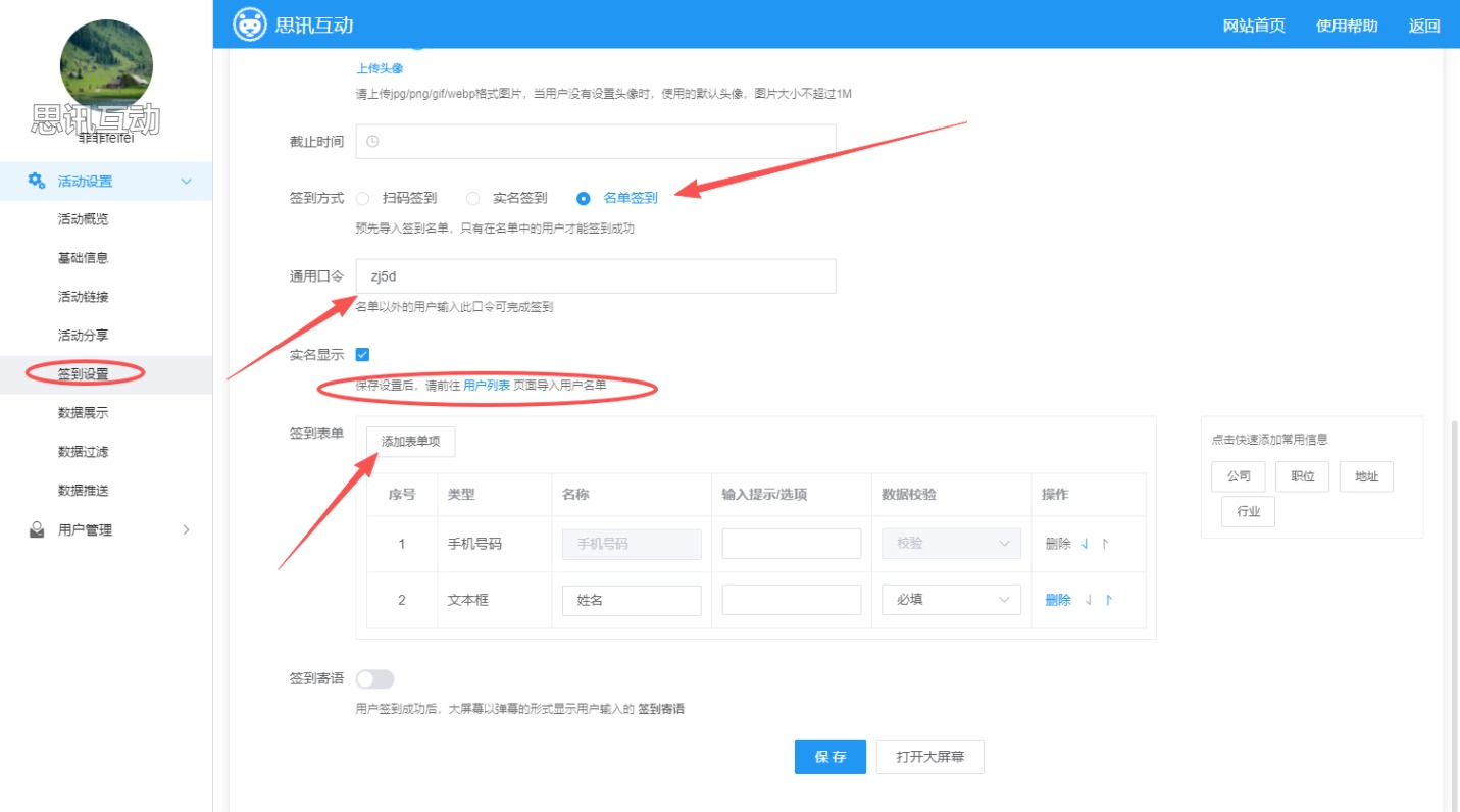 (1)名单签到:预先导入名单,只有名单内的用户才能签到成功,如果想要名单外的人也能签到进来,可以设置通用口令(通用口令可以自定义),扫码后名单外的输入口令也可以签到进来,首先选中“名单签到”,“实名显示”等三个滑块设置好后,先点击“保存”。(如图6)