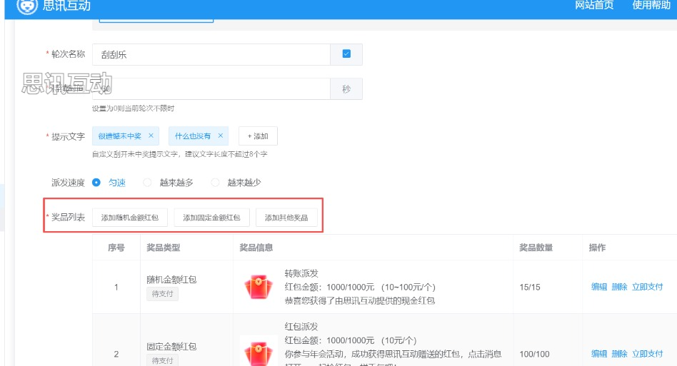 (1)在活动概览界面,找到“红包奖品”,进入刮刮乐后台设置界面。点击“添加轮次”,如下图,进入添加轮次界面。