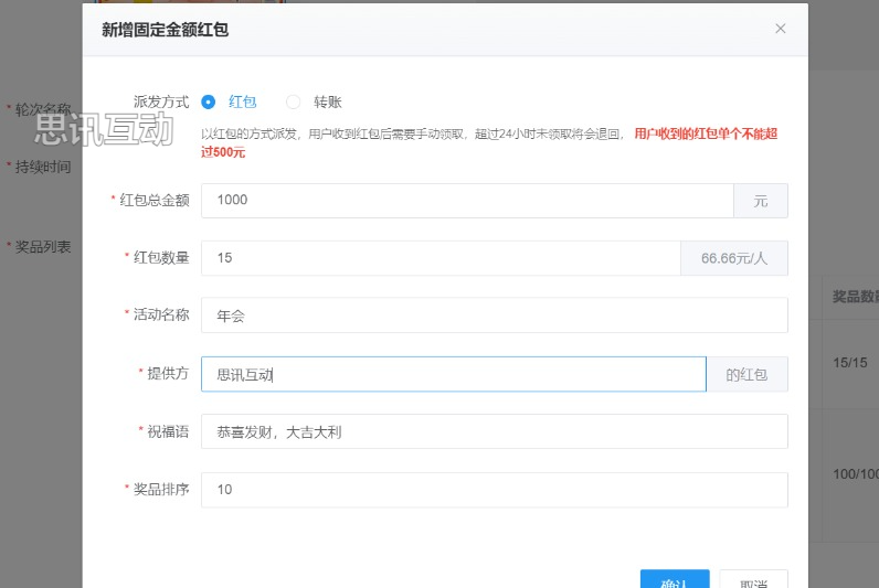 选中“固定金额红包”后,出现如下界面(见图7),依次填写好信息红包总金额和红包数量、活动名称、提供方和祝福语、排序等,比如总金额要发1000元,发15个,那么每个红包就是66.66元,设置好点击“确认”。