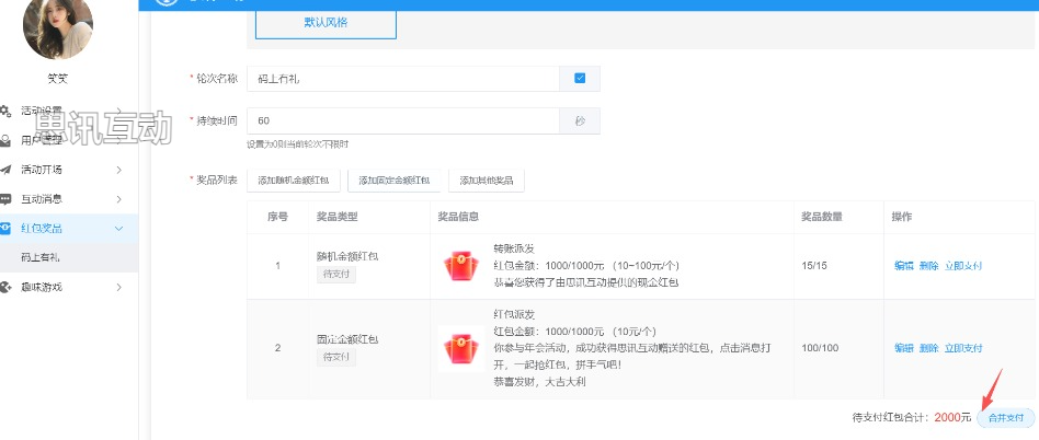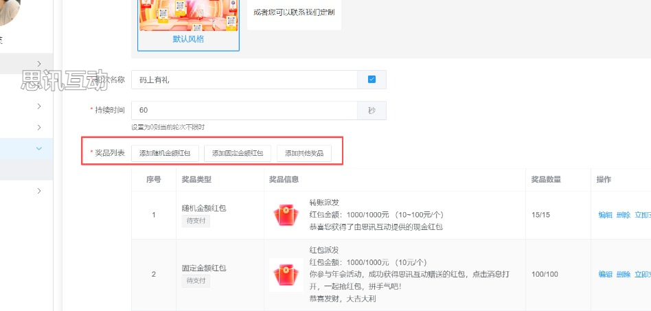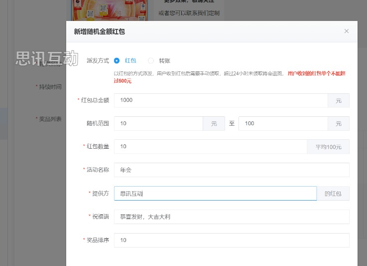 4)奖品列表:首先需点选奖品类型,共有三个选项:“随机金额红包”、“固定金额红包”与“其他奖品”(注意发出去的单个红包不能超过500元)。