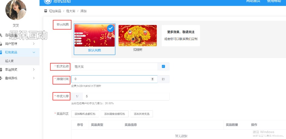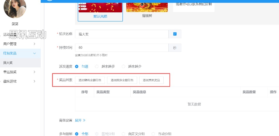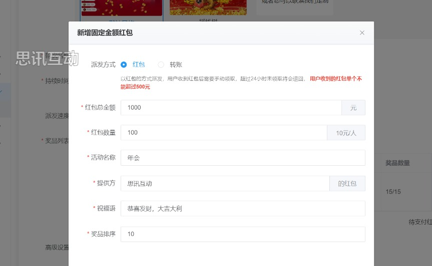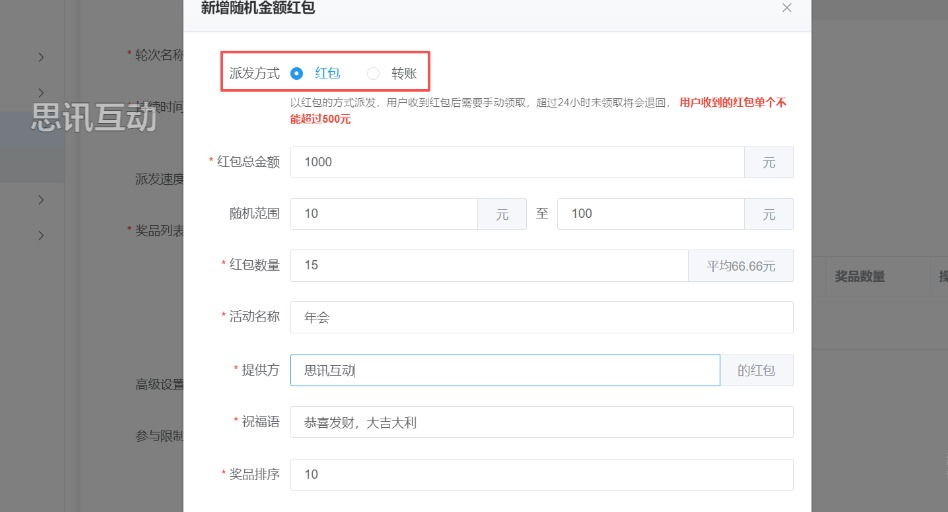 (4)奖品列表:首先需点选奖品类型,共有三个选项:“随机金额红包”、“固定金额红包”与“其他奖品”(注意发出去的单个红包不能超过500元)。