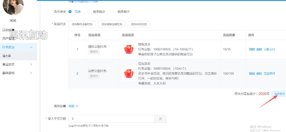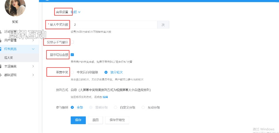 (5)高级设置中设置好单个用户最大中奖的次数(设置为0,则不限次数)。