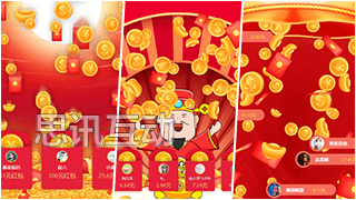 (1)默认风格:默认的红包雨效果,大屏幕从上到下不断掉落元宝、金币、奖券,用户在手机端不断点击手机屏幕,点中即有机会中奖哦!