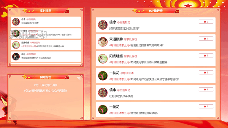 目前很多活动依旧停留在授课讲授的方式,这种方式只需要嘉宾讲话,台下观众听就可以,最后选两三个幸运儿代表提问。这样的方式对于绝大部分参会者是不公平的,同样主办方也无法真正了解大众的需求。思讯互动推出的提问墙功能,给予更多参会者发声的机会。参会者把想问的问题输入,直接登上大屏幕,主办方对于用户的需求一目了然。同样,参会人员看到比较认同的问题,为它点赞,让优质的问题登顶排行榜,主办方更好地掌握大众的疑问点。