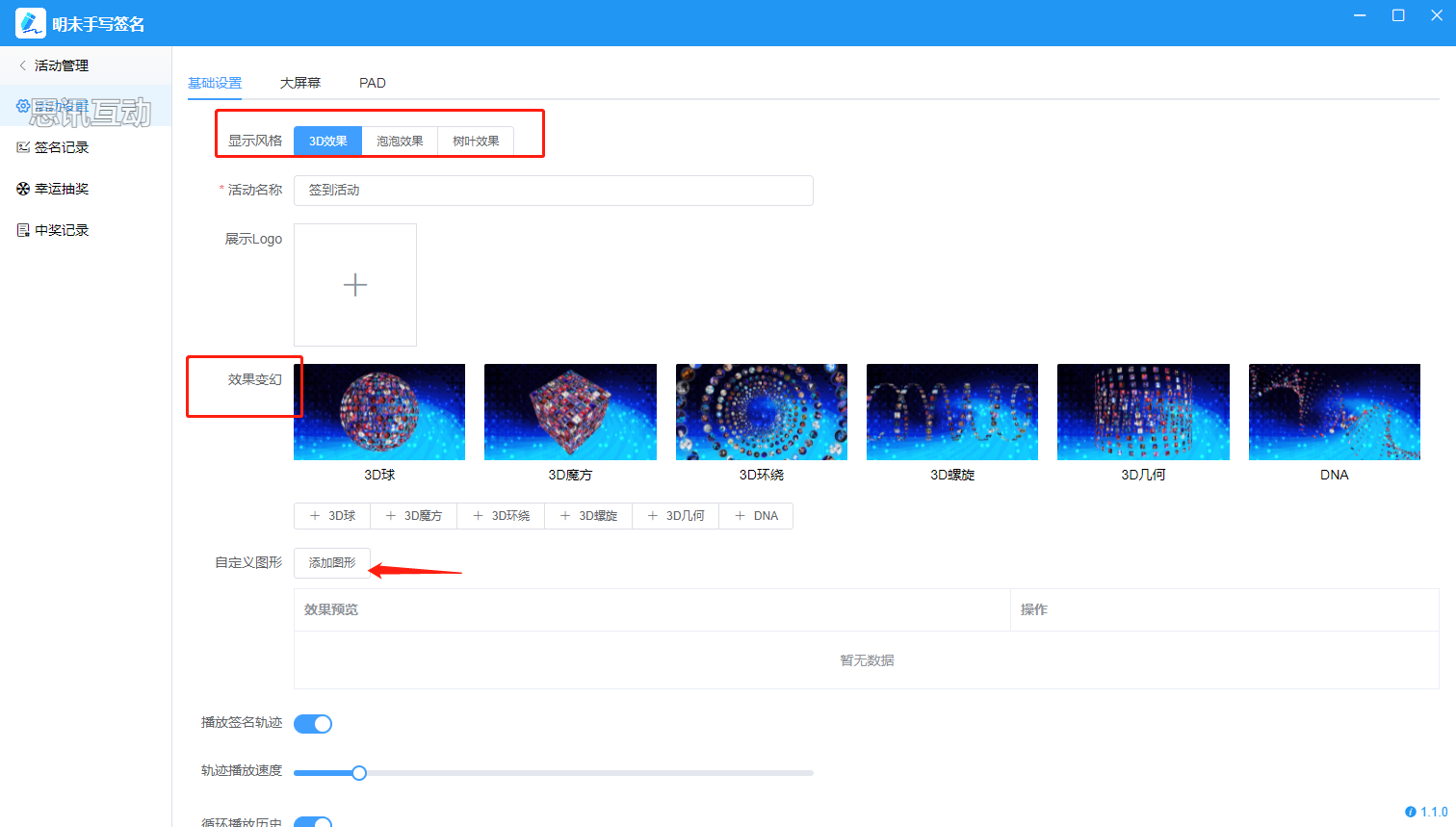 进入后第一个基础设置,显示风格,这里我们选择3D效果。然后输入活动的名称,变幻效果为大屏幕展示的效果,拖动可以排序,点击添加图形可以添加自己的图形