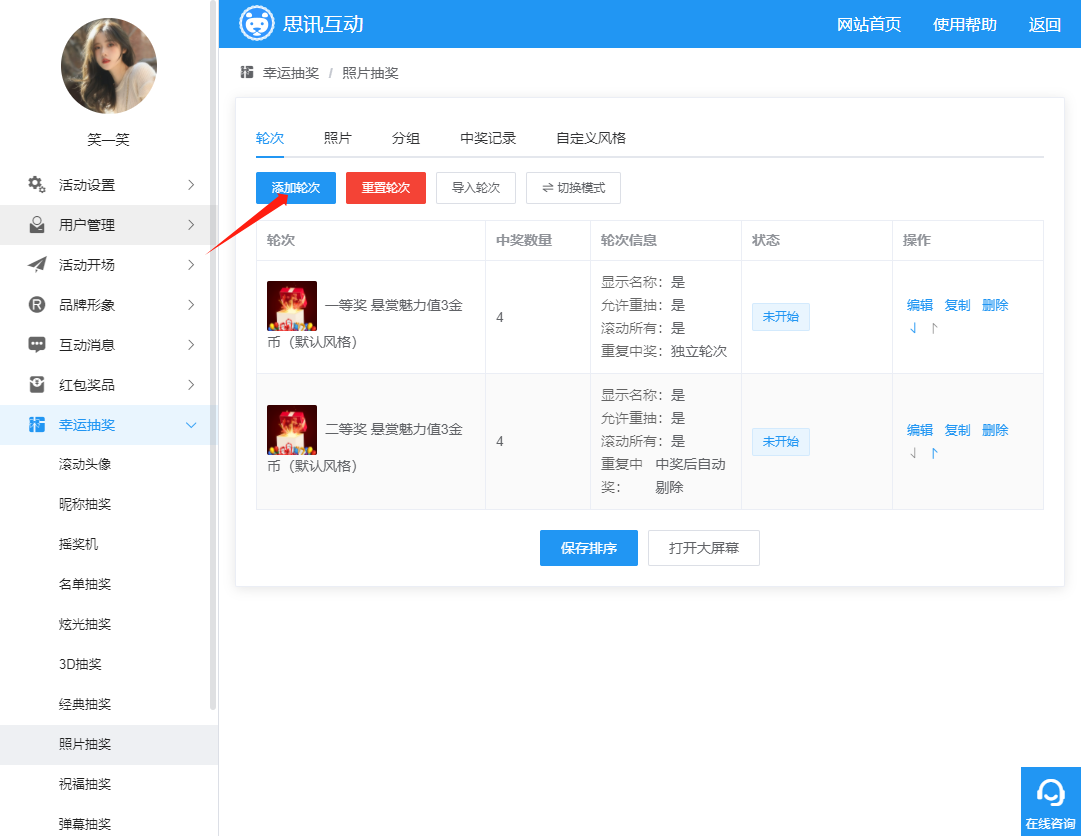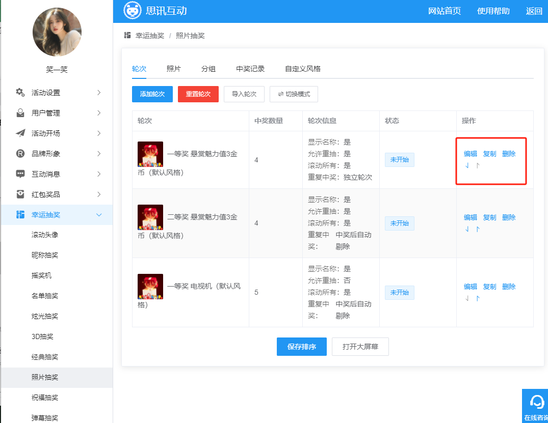 (4)返回轮次添加页面,可查看轮次信息,如图5。在这里可查看每一轮添加的抽取人数、轮次信息、轮次状态,并进行编辑、复制上一轮奖项、删除的操作。鼠标点击“↑”“↓”可对轮次进行排序。