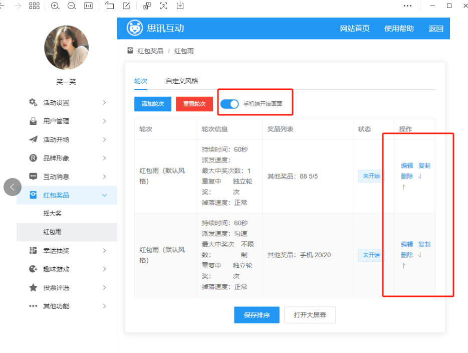(8)设置好后,点击页面底部“保存”,将跳回原来的轮次添加界面,如图8;可对设置好的轮次进行编辑、复制、删除操作,手机端开始画面指的是扫码进入后显示的玩法介绍,扫码后需要点击进入游戏,才会进入准备界面,关闭则扫码直接进入准备界面。如图10。
