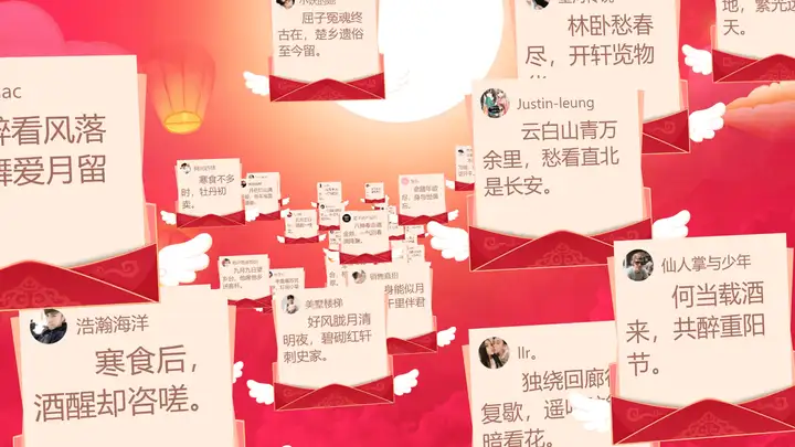 系统将所有祝福语以天灯、信笺或烟花形式投射大屏,