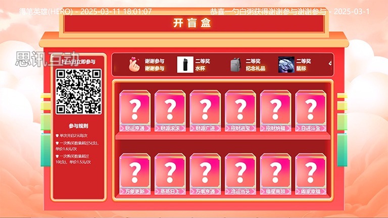 - 盲盒抽奖:对年轻客群吸引力强,适合商场潮牌区、文创市集等场景。将盲盒元素融入大屏抽奖,契合年轻人对 “未知惊喜” 的追求。