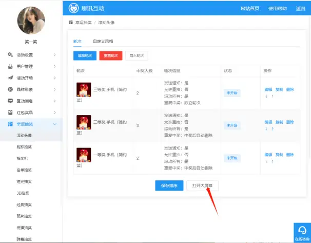 (1)如图6,是抽奖的轮次配置。点击整个活动配置中任何一个“打开大屏幕”,可进入大屏幕界面,点击大屏幕“滚动头像”选项,进入滚动头像抽奖大屏幕页面,如图6。