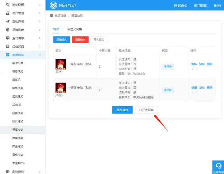 (1)如图5,是祝福抽奖的轮次配置。点击整个活动配置中任何一个“打开大屏幕”,可进入大屏幕界面,点击大屏幕“祝福抽奖”选项,进入祝福抽奖大屏幕页面,点击大屏幕端祝福抽奖可切换奖项轮次如图7。