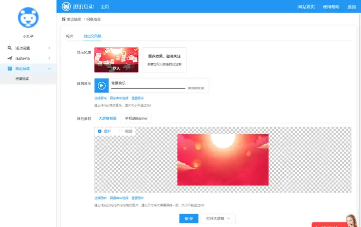 (5)切换到“自定义风格”选项卡,可更换祝福抽奖的显示风格、背景音乐、大屏幕背景和手机端中奖名单的banner图,如图6。