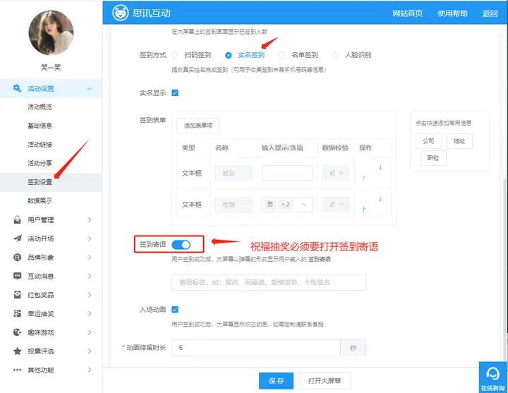 (1)在互动功能页面点击滑块开启祝福抽奖,因为是抽取祝福,所以先到签到页面,需打开实名签到,确保签到寄语已经开启,如图1。