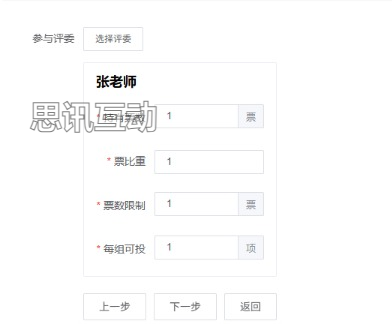 在评选轮次中,您可以灵活选择评委,并对评委的票权重、持有票数、票数限制以及每组可投数量进行详细设置。这一优化使得评选过程更具专业性与可控性,特别适用于需要专业评委参与打分的活动,如专业赛事评选、专家评审等场景。