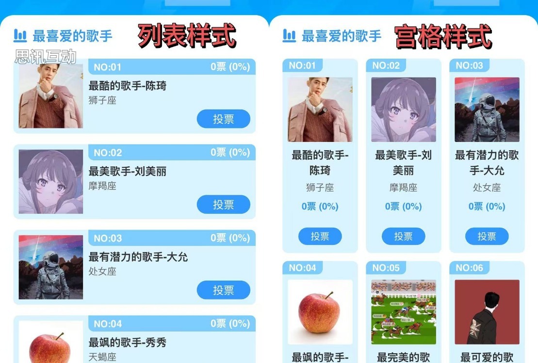考虑到用户在手机端的操作体验,我们新增了宫格、列表两种手机端样式。参与者在手机上参与投票时,可根据个人喜好选择更为便捷、舒适的展示方式,进一步提升了手机端投票的交互性与便捷性。