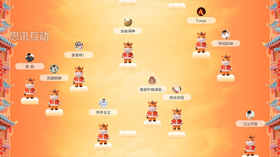 当下流行的玩法适配年轻人居多的年会,嘉宾扫码参与后,大屏幕呈现暖橙国风云端场景:云雾缭绕的中式楼阁搭配祥云装饰,身披红装的小马站在云朵踏板上,。嘉宾操作手机控制小马向上跳跃,跳上云朵平台,大屏幕实时显示高度与排名。既考验反应速度,又展现 “一马当先” 的奋进精神,让现场充满青春活力。