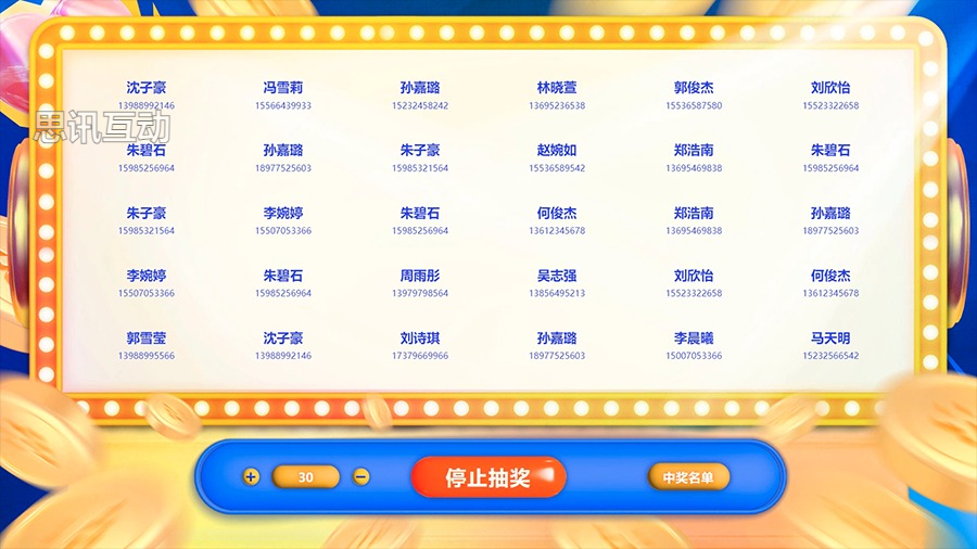 - 视觉元素:金色灯光边框 + 蓝色渐变背景,搭配金币装饰,名单以滚动列表形式呈现,整体华丽且有 “大奖揭晓” 的仪式感。