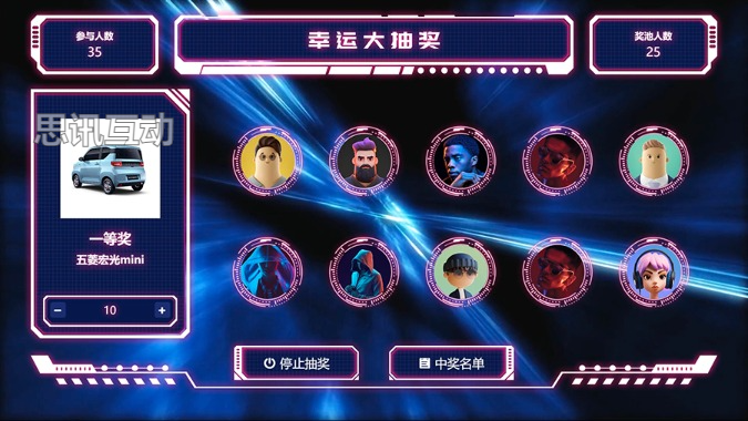 - 视觉元素:深蓝色暗纹背景 + 霓虹蓝光线条装饰,参与人员以圆形头像形式排列滚动,界面清晰展示 “参与人数”“奖池人数” 等数据,按钮带有科技感图标。