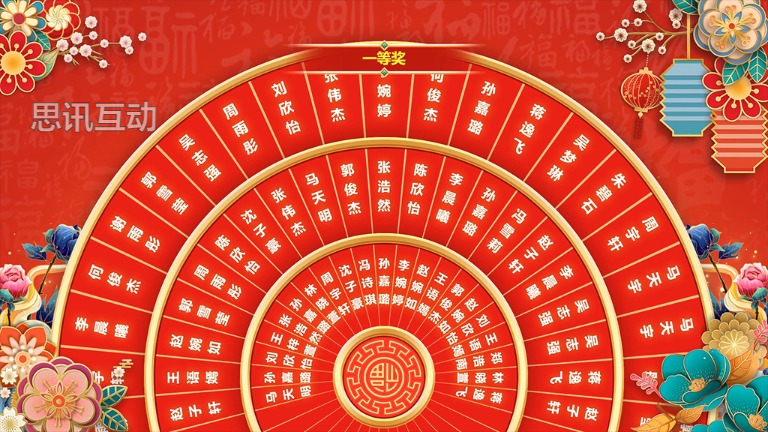 - 视觉元素:以正红色为底色,搭配烫金轮盘边框,融入 “福” 字、传统花卉、中式灯笼等春节元素;轮盘分区展示参与人员名单,顶部标注奖项,整体是浓郁的中式喜庆设计。
