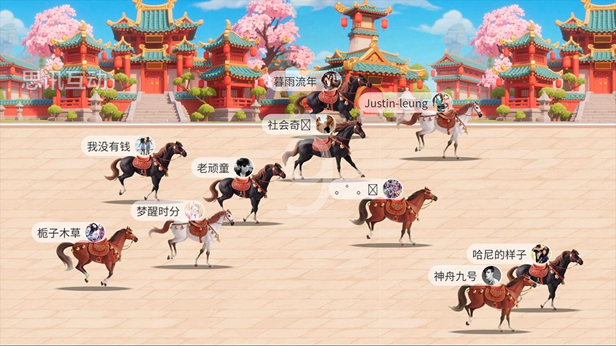 嘉宾扫码即可快速进入游戏,快速摇一摇手机,大屏幕瞬间呈现国风赛马场景:红墙绿瓦的中式楼阁搭配粉嫩樱花树,多匹装饰精致的骏马在赛道飞驰。摇动手机的速度越快,对应骏马奔跑越迅猛,马蹄扬起的尘土特效更添真实感。这场国风赛马会暖场效果拉满,瞬间让现场年味十足、气氛火爆。