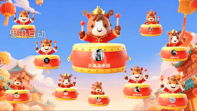 嘉宾点击手机敲鼓按钮,大屏幕呈现3D 国风鼓乐场景:蓝天祥云配中式楼阁,红灯笼点缀其间,虎头帽萌马端坐在印着 “福” 字的巨型红鼓上,鼓身显示序号与嘉宾头像。每点击一次,萌马挥槌击鼓,鼓面迸出 “好运” 特效,大屏幕中央实时显示 “击鼓进度值”;点击节奏越密集,萌马击鼓越欢快,进度满格触发 “鼓乐齐鸣” 全屏动画。萌趣又热闹的玩法,是晚宴暖场的绝佳选择,传递 “马运亨通” 的新春祝福。