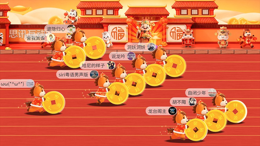 嘉宾按住手机屏幕图标快速旋转,大屏幕同步呈现国风招财场景:红墙黛瓦的建筑搭配 “福” 字装饰与舞狮摆件,萌马身披红绸、头顶福冠,推着巨型金币狂奔,每匹小马对应嘉宾昵称。旋转频率越高,小马推金币速度越快,金币上 “福” 字光泽更盛,金色元宝特效飘落,寓意 “招财进宝”,让嘉宾在互动中沉浸于财源滚滚的新春喜悦。